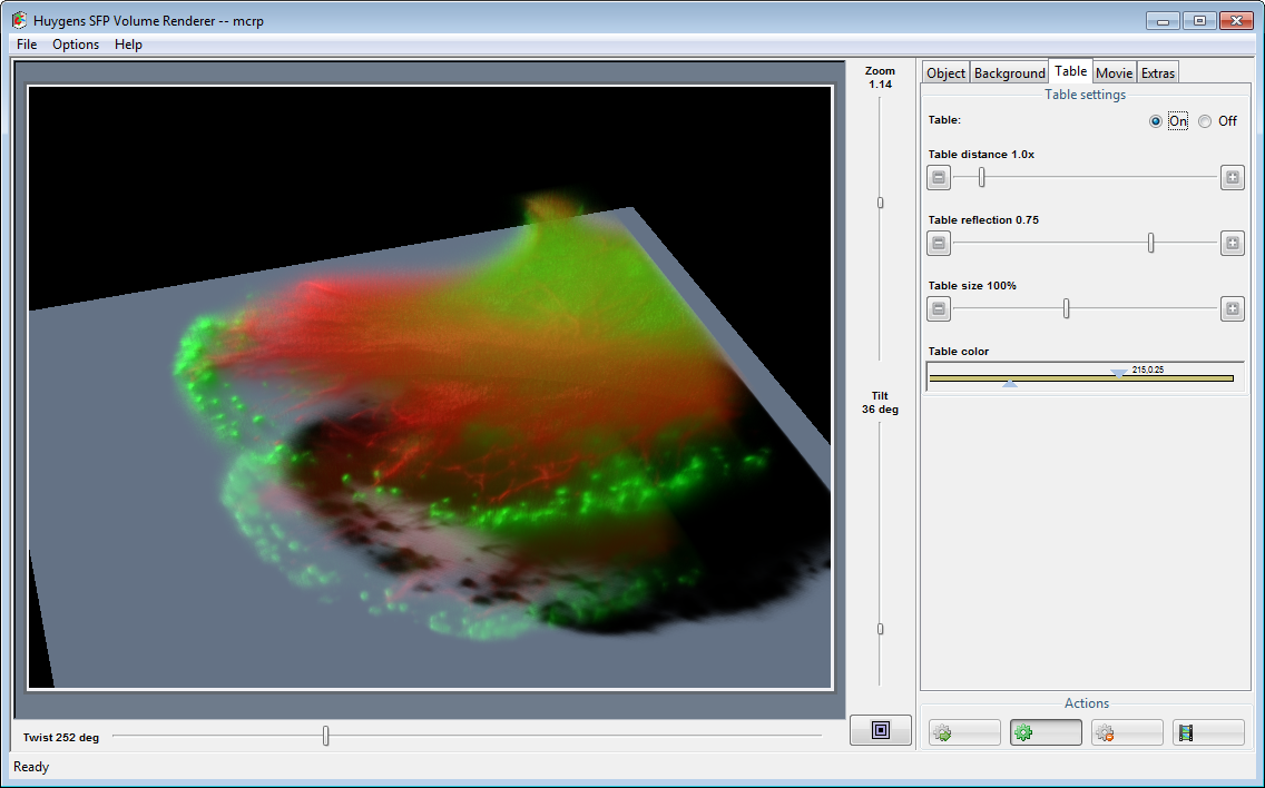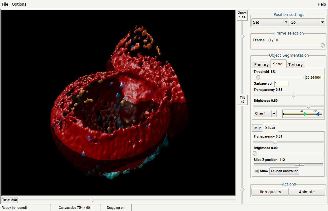 The SFP Renderer (Advanced mode) The Simulated Fluorescence Process Renderer considers a 3D microscopy image as a distribution of fluorescent material. The SFP algorithm creates depth cue rich images from unprocessed data, and is eminently suited for rendering 3D microscopic datasets since it does not rely on boundaries or sharp gradients. Since the SFP algorithm is based on ray-tracing, it is particularly suited for GPU acceleration. With an advanced visualization license, all parameters can be freely adjusted, and the internal animator can be used. Furthermore, hard iso-surfaces like those found in the surface renderer can be brought into the SFP scene, with fully realistic shadows, taking the rendering to another level. Finally, the whole scene can be manipulated with omni-directional cutting planes, allowing you to freely slice through your virtual object in real time. |