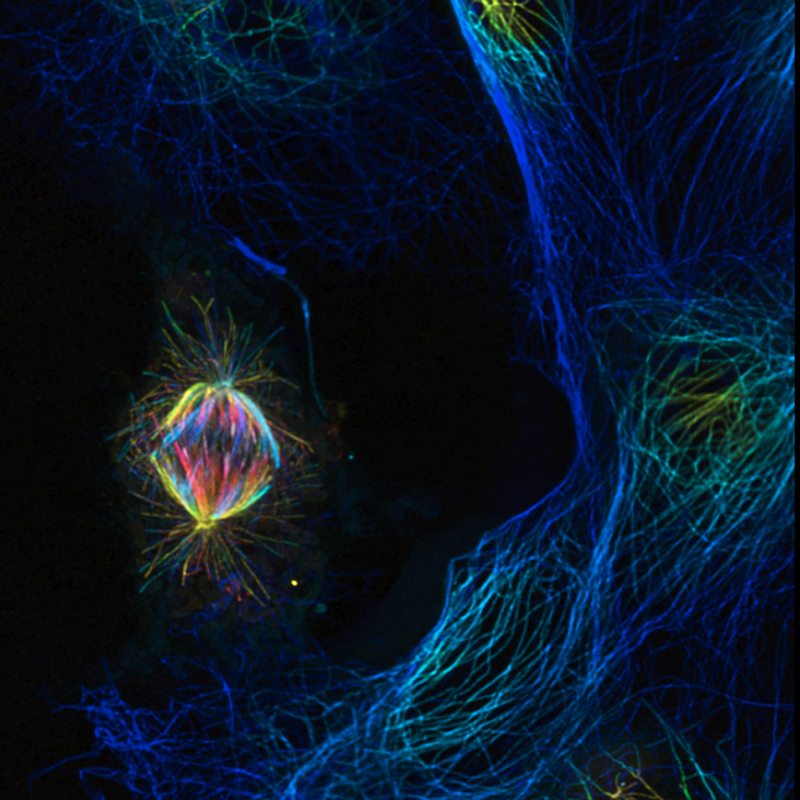 This image shows COS-7 a fibroblast-like cell line derived from monkey kidney tissue, with confocal imaging of cytoskeletal protein tubulin color coded for depth. Mitotic spindle clearly visible in the center. Images were taken with a Leica SP8 microscope and deconvolved with Huygens software.
