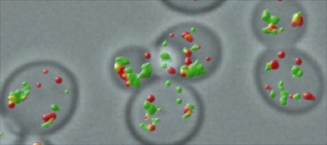 Yeast organelle transport. Huygens deconvolved confocal time series. Late-Golgi marker Sec7-DsRed, Early Golgi marker Cog1-GFP.