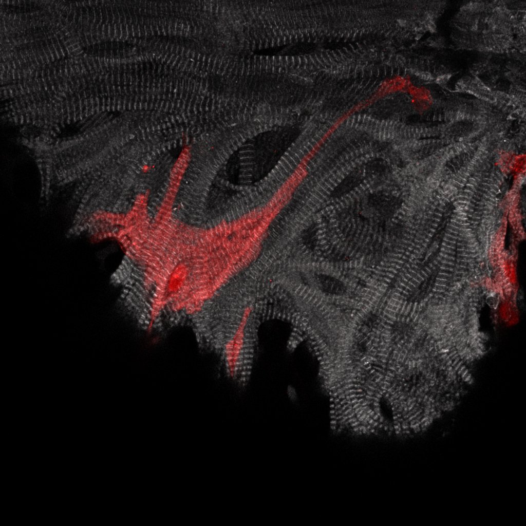 Deconvolved confocal image of a cardiomyoycyte during regeneration. The acquisition is on the whole mount zebrafish heart so we can observe the sarcomera in all the cardiomyocyte (specific structure present in all the cardiomyocyte, leading to contraction of the heart. The sarcomera is the kind of lines that you can see in all the cells). The cardiomyocyte with atypical shape comes from a lineage tracing doing to identify these cells during the adulthood. This picture was adquired with a Zeiss 880 Confocal