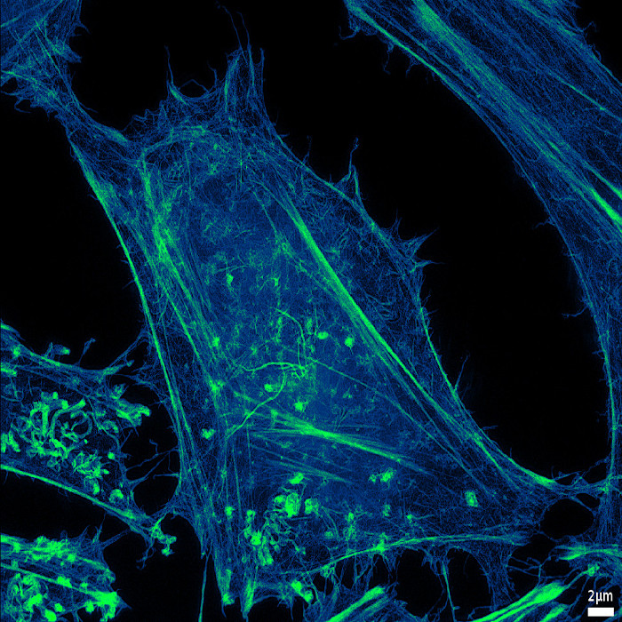Hela cells with actin cytoskeleton labelled (Phalloidin, Abberior STAR Red). Imaged with Abberior Instruments’ STEDYCON and deconvolved with Huygens Professional.