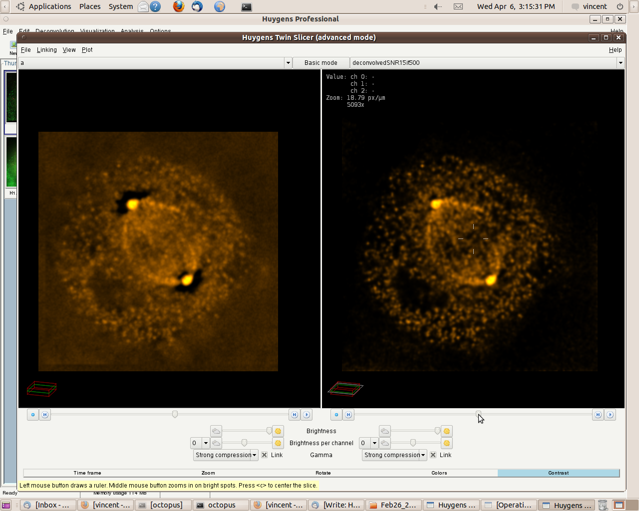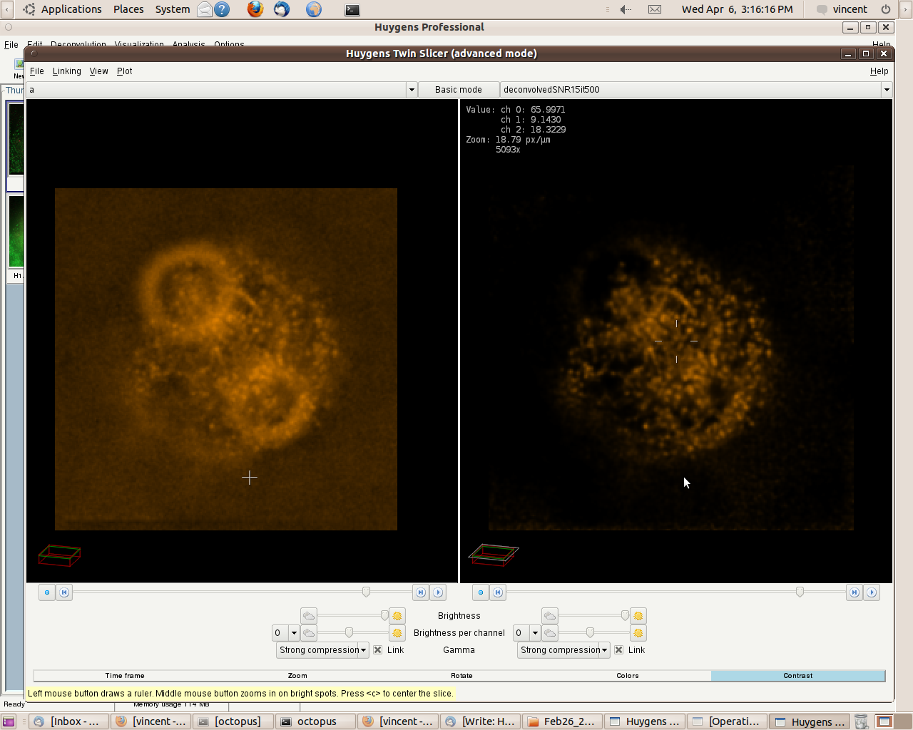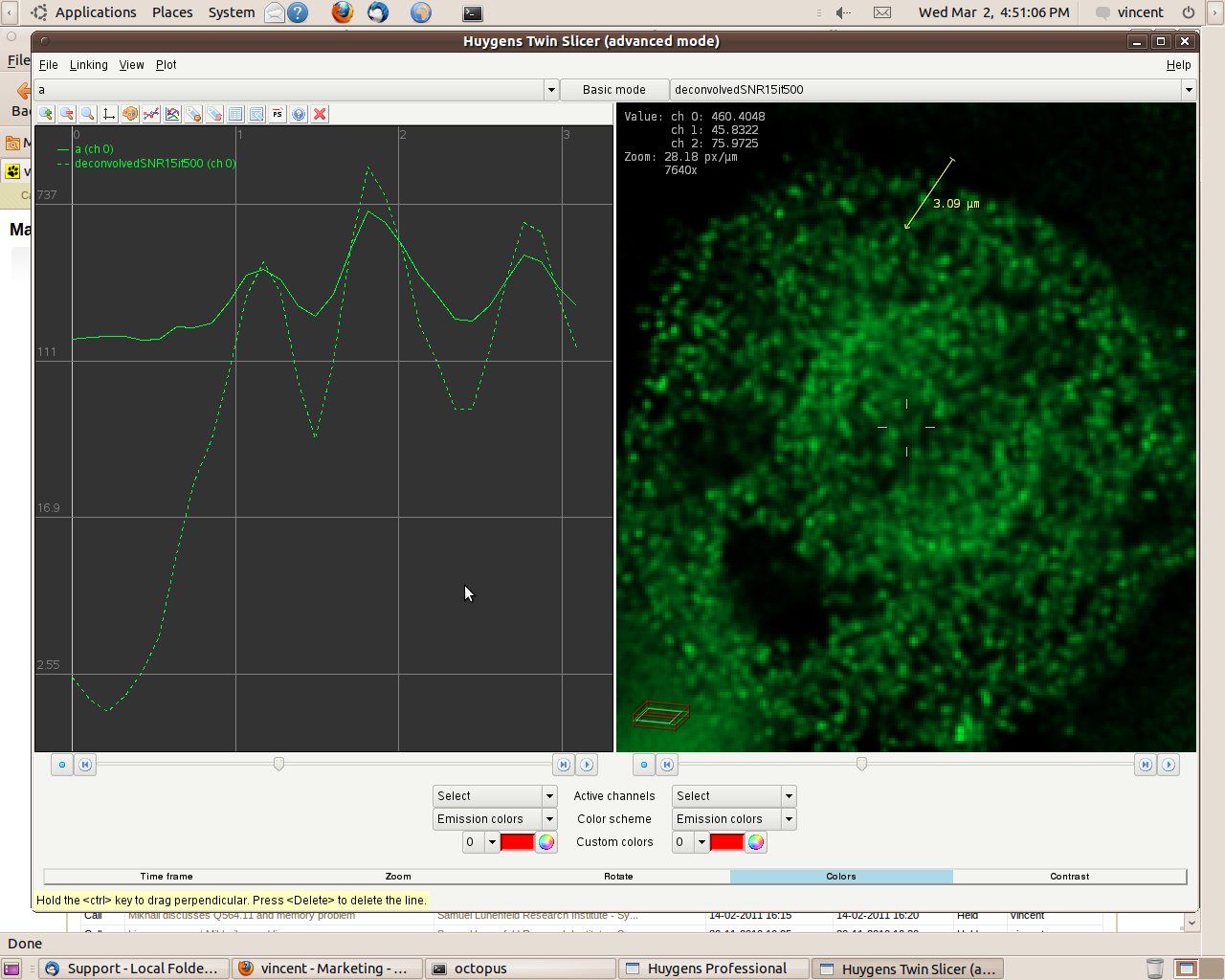 You can create a line intensity profile (seen on the left) of images opened in the Twin Slicer by drawing a line with the mouse cursor, and by selecting under 'Plot', 'Plot both slicers'. When comparing the intensities between "X" (straight line) and Huygens (dashes line)' in a randomly taken area, you can see a clear difference in peak highs and lows (dynamic range), and the improvement in distinguishing detail. Image "X" is hidden by the graph on the left and Huygens is shown on the right.