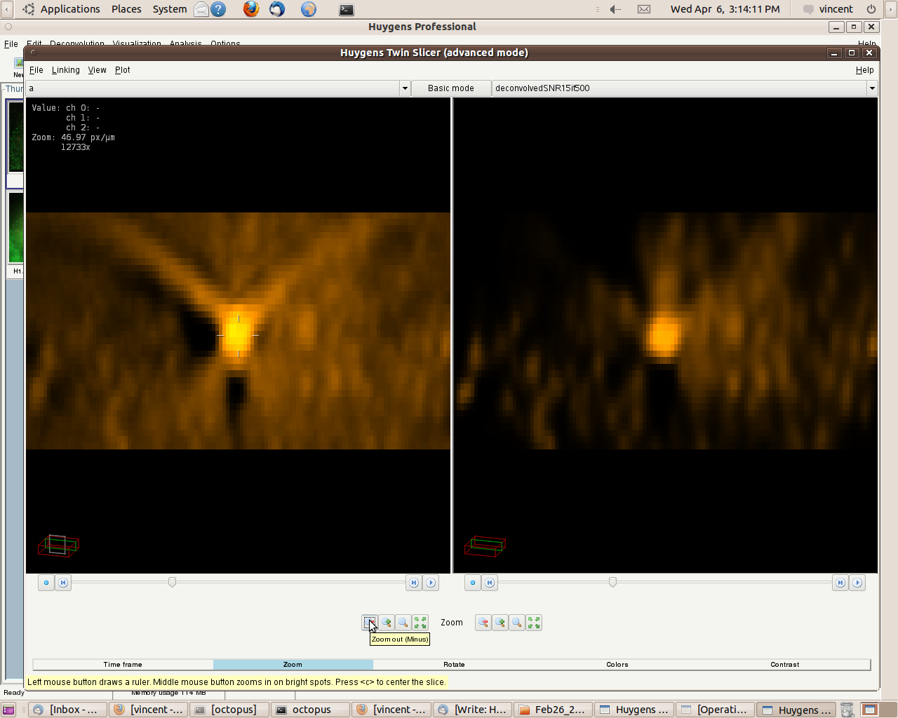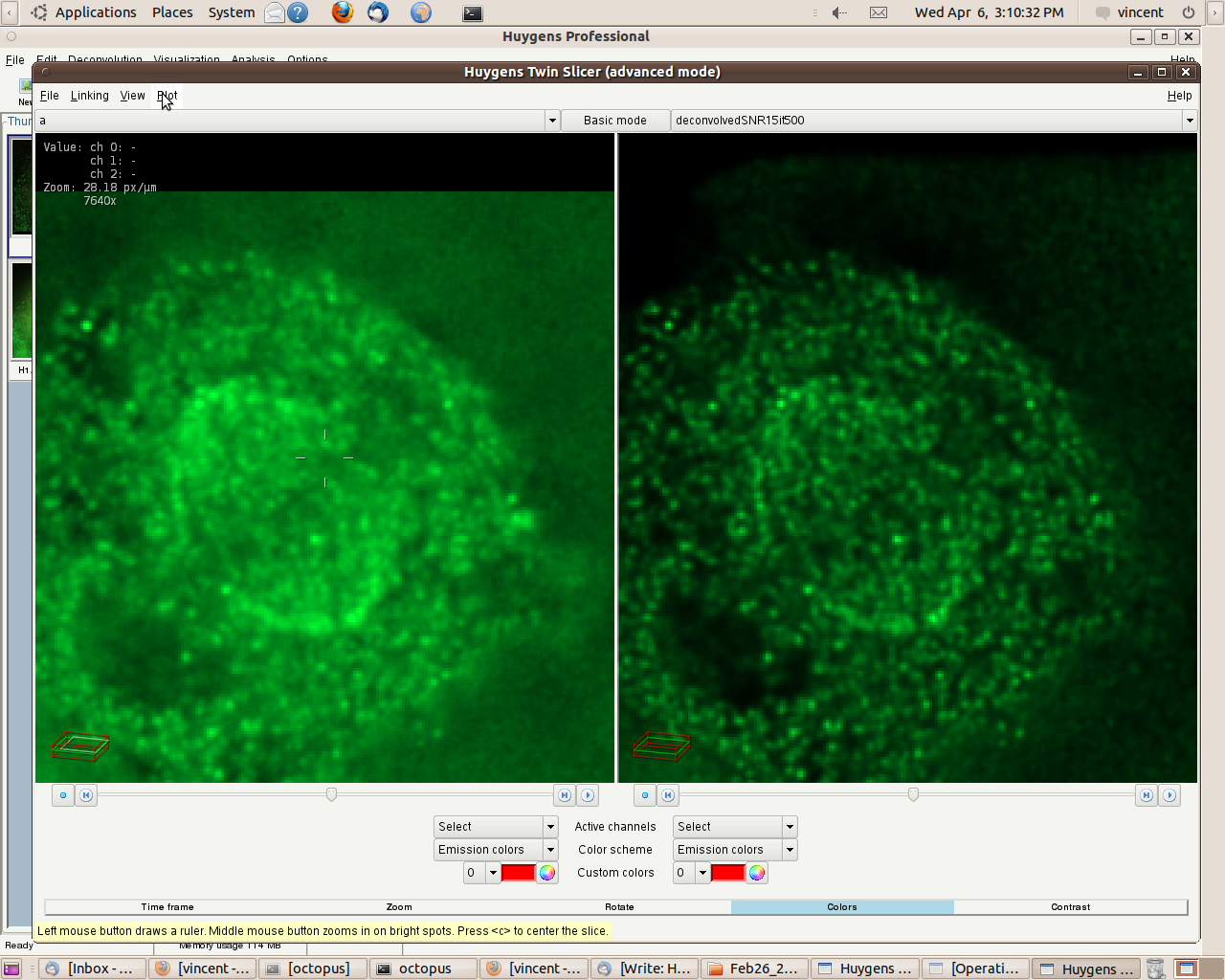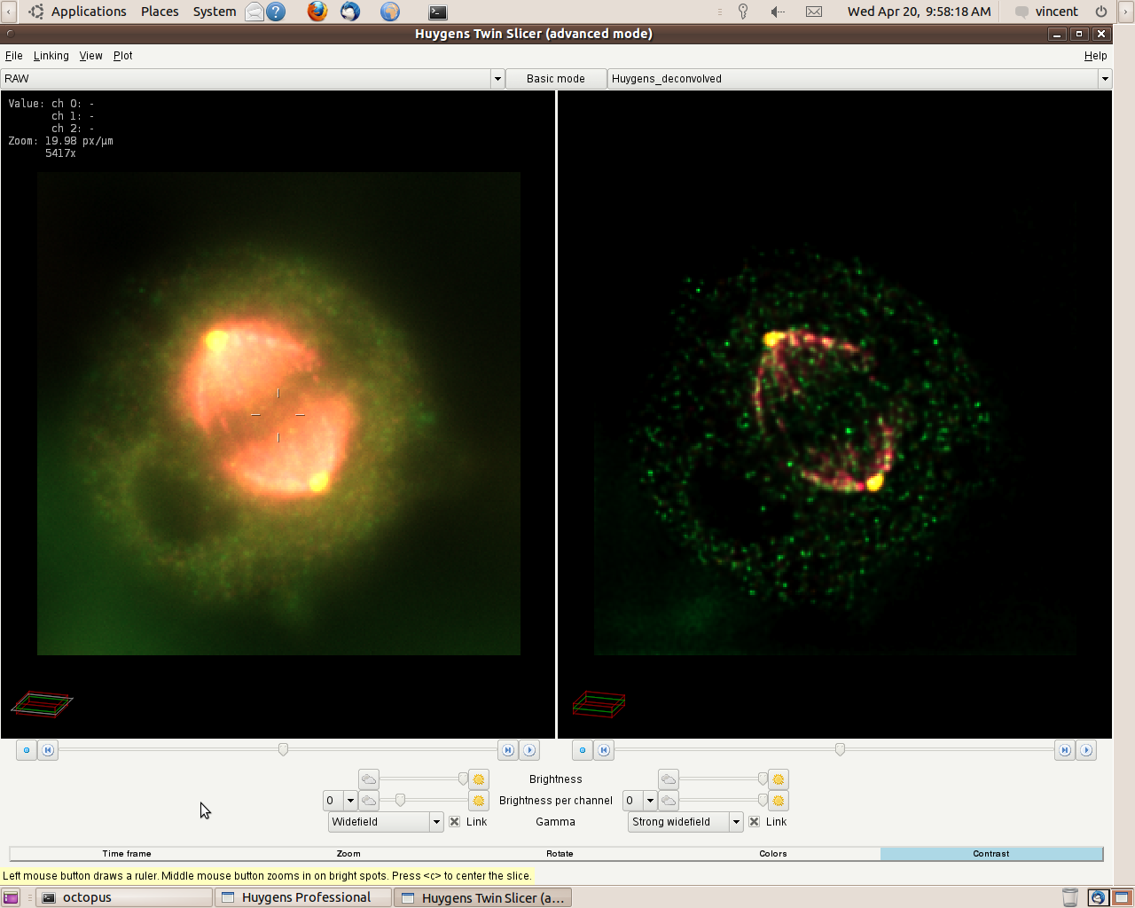 You can create a line intensity profile (seen on the left) of images opened in the Twin Slicer by drawing a line with the mouse cursor, and by selecting under 'Plot', 'Plot both slicers'. When comparing the intensities between "X" (straight line) and Huygens (dashes line)' in a randomly taken area, you can see a clear difference in peak highs and lows (dynamic range), and the improvement in distinguishing detail. Image "X" is hidden by the graph on the left and Huygens is shown on the right.