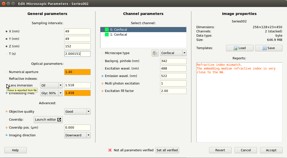 Huygens パラメータエディタは、ユーザーがこのタスクを実行できるように設計されています。 箇条書きのパラメータのリストには、パラメータ値がどのように取得されたかを示す色があります(スクリーンショットを参照)。 検証後、パラメータテンプレートを保存して、将来(再)使用することができます。