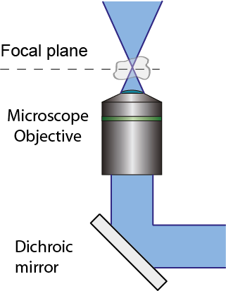 コンフォーカル顕微鏡では、顕微鏡の対物レンズに入射するコリメートされた励起レーザービーム(青色)は、通常、サンプルに焦点を合わせる前に、対物レンズの後方開口部(射出瞳)をオーバーフィルします。