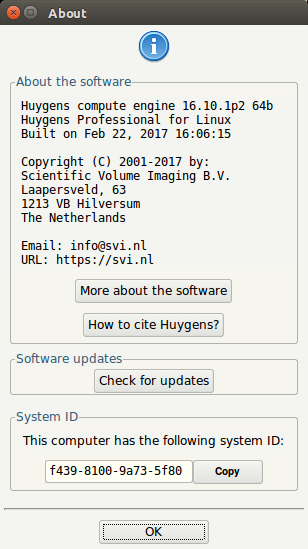 找电脑的 system ID: 请下载惠更斯 Huygens 软件,安装并启动,第一次安装的话,system ID 会自动出现在一个新视窗中。已经安装了惠更斯 Huygens 软件的电脑,可以到 Help → About 查看以下视窗 - System ID 。