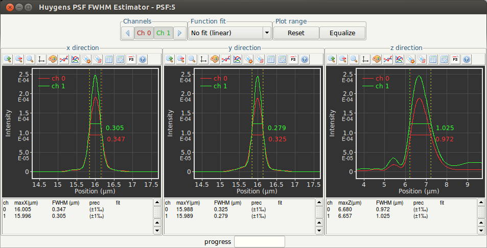 The PSF FWHM Estimator creates a line intensity profile through the center of the PSF in all dimensions, and measures the X value of the peak maximum and the width of each peak at approximately half of the maximum value using a curve fitting procedure. Curve fitters such as Gaussian, Lorentzian, Voight and Pearson, are available for this. This is done for all channels.