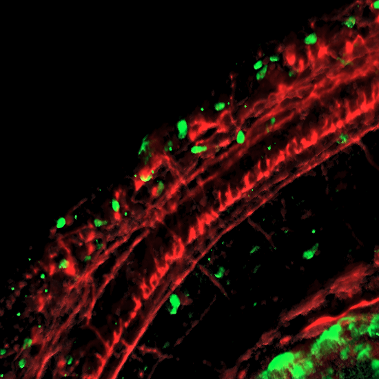 Huygens deconvolved and MIP rendered confocal image (Nikon; NA 0.45) of a tadpole intestine (Xenopus embryos) with nuclei in orange and muscle actin in cyan. The direction of the gut looping can be used as a readout for proper asymmetric organ development. Looping in the other direction is a sign of perturbed Nodal/Notch signaling.