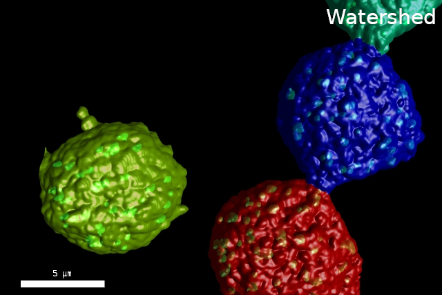 When objects are very close to each other, the watershed segmentation method provides the solution to separate objects which else would merge in one object. More.