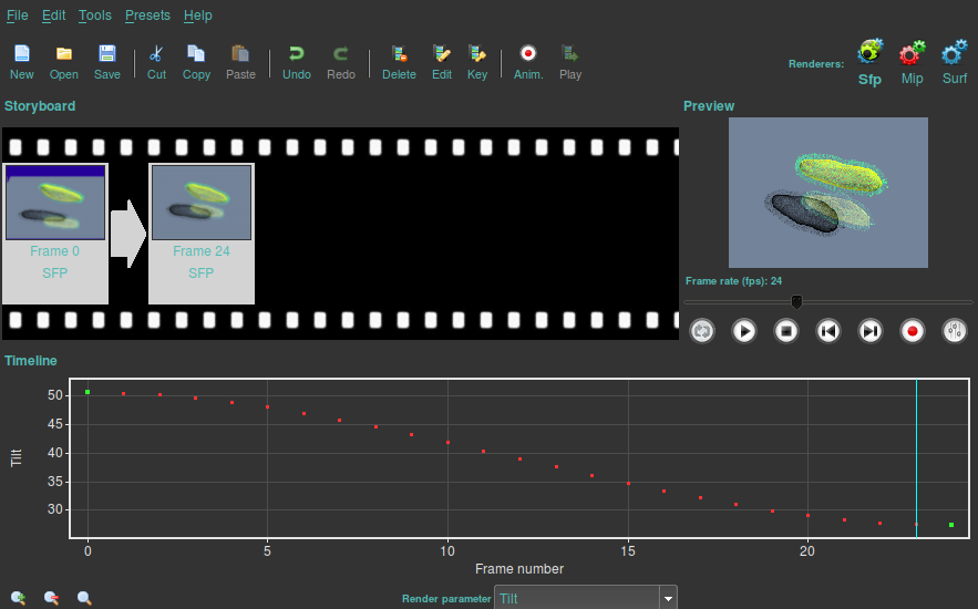 Within the Huygens Movie Maker three powerful Visualization renderers can be used, namely: The Surface Renderer, The MIP Renderer and The SFP Renderer. The Movie Maker accepts a mix from different renderers in a single movie.