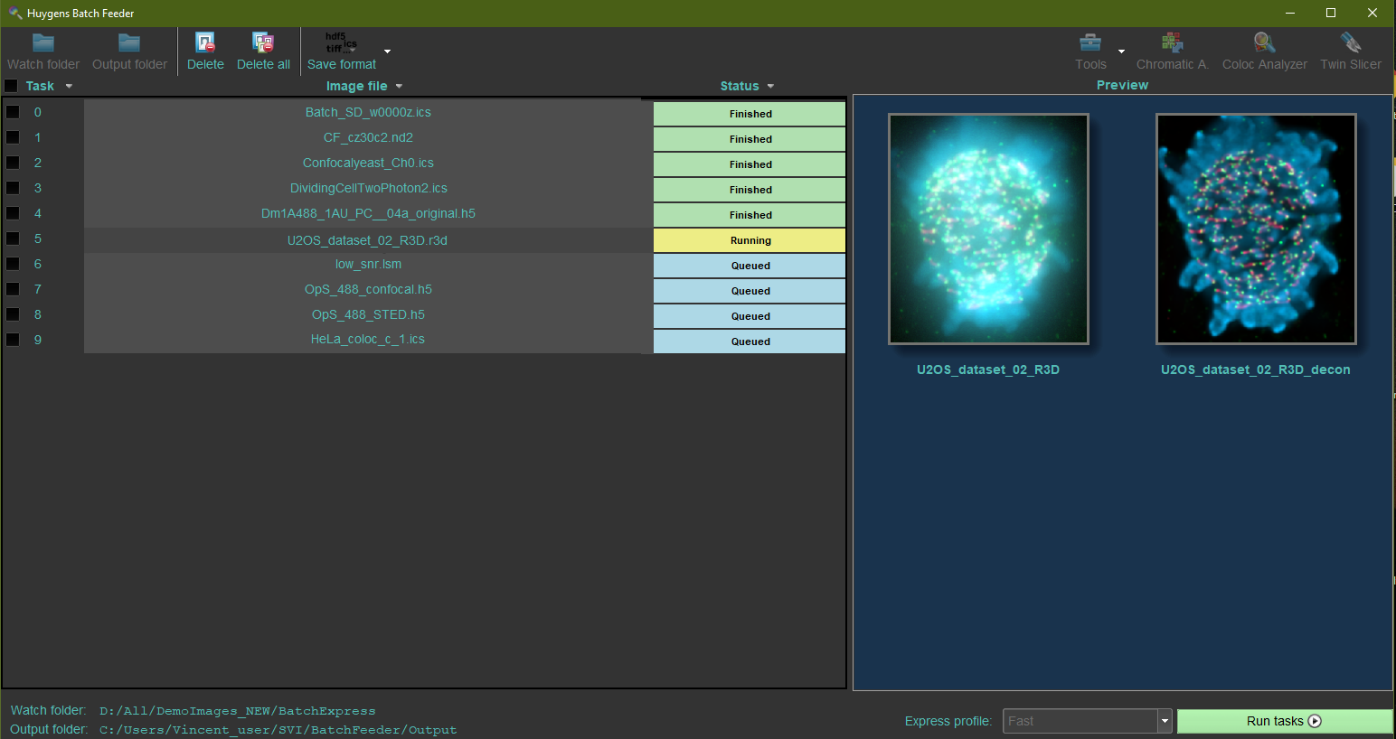 新しいバッチフィーダーは、Watched フォルダーディレクトリに存在する画像の完全に自動化された画像処理パイプラインです。 以前に画像取得したか、またはその場で画像取得した画像は、Watched フォルダー内に保存でき、Deconvolution Express によって数秒以内に即座に自動的にデコンボリューション処理され、Outputフォルダーに保存されます。 両方のフォルダーは、ネットワーク内の任意の場所に配置できます。バッチフィーダーは、スマートテンプレートおよび Huygens がよく知られているのと同じ高品質のデコンボリューションアルゴリズムを使用します。バッチフィーダーは、さまざまな種類の顕微鏡とファイル形式をサポートしているので、画像ファイルとの互換性は、問題になりません。