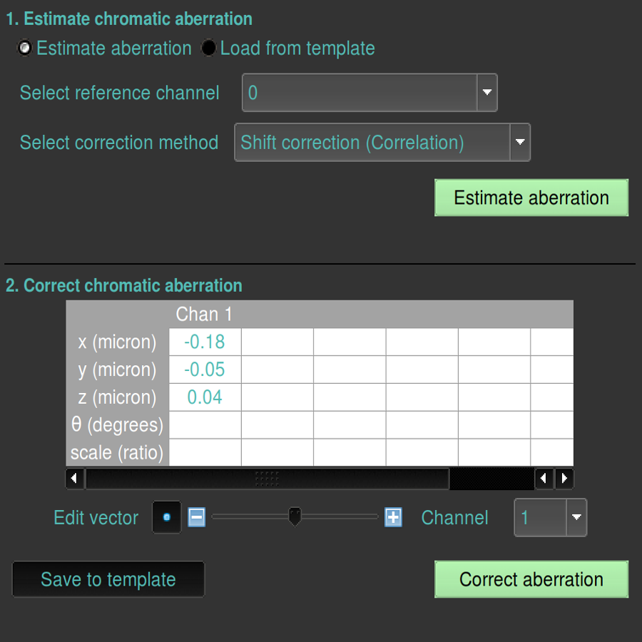 色収差は、コロカリゼーションなどのマルチチャネル解析の結果または、対象物ベースの解析の一部としての 距離測定に大きな影響を与えます。 Huygens Chromatic Aberration Corrector は、いくつかの種類の 歪みを補正するための使いやすいウィザードを提供します。