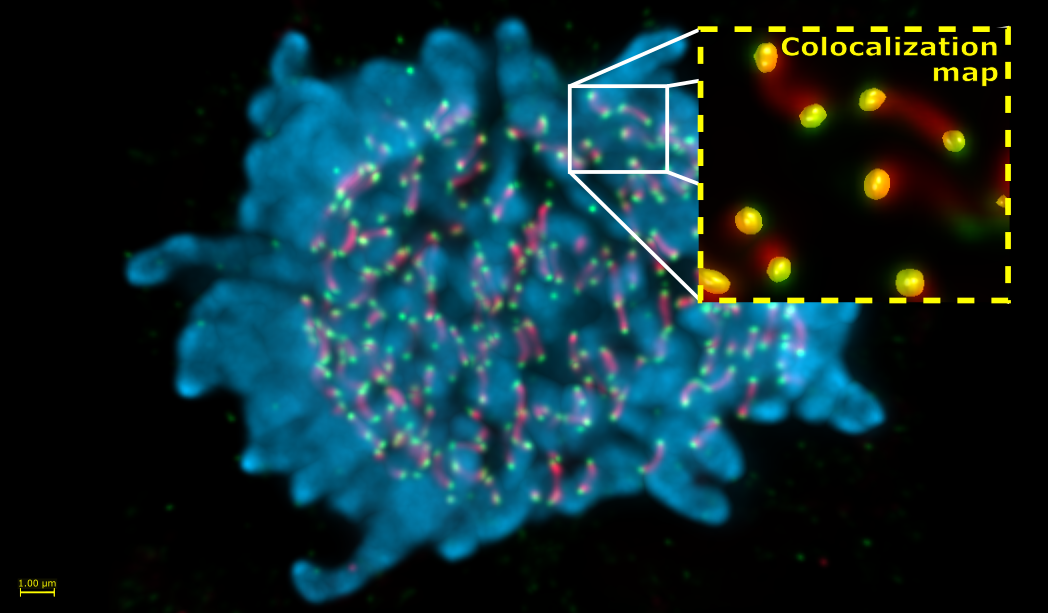 Within seconds, Huygens Colocalization Analyzer calculates all common pixel-based colocalization coefficients for multichannel images including Pearson, Spearman, Manders and Van Steensel. Different thresholding methods are available, and the colocalization is visually presented in a unique surface map projected on a MIP of the concerned channels. The analysis can be focused on a specific region of interest (ROI), and is more reliable when preceded by the correction of noise, blur, and background through true deconvolution, and by a Quality Control check for any additional imaging issues, such as hot/cold pixels, crosstalk and chromatic aberration. For object-based colocalization, we like to refer you to Huygens Object Analyzer.