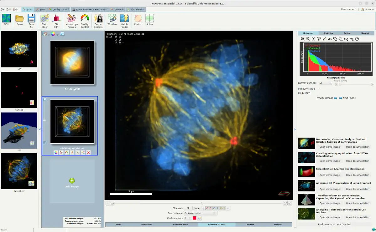 Huygens Essential is part of the Huygens Software, tailored for easy deconvolution, restoration, and analysis of all your microscopy images. Deconvolution Express deconvolves all your images fully automatically, and the available Wizard can be used to guide you through the process of deconvolution. Huygens Essential is able to deconvolve a wide variety of 2D-5D images ranging from widefield images to multi-photon, spinning-disk, confocal, Array Detector, STED, VT-iSIM, Rescan, or light-sheet images. Comparison of raw and deconvolved results is facilitated with the dual 4D slicer tool, and powerful and fast 3D renderers produce high quality representations of your data. Based on the same image processing engine as Huygens Professional, Huygens Essential combines the quality and speed of the algorithms, also available in Professional, with the ease of use of a wizard-driven intelligent user interface. Compatible with Windows, MacOS, and Linux, and offering configurations for a computer-locked license, or Everywhere/Floating via a login, usage of Huygens Essential is extremely flexible!