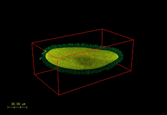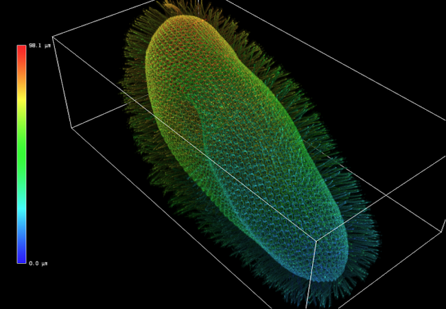 Image Description: The MIP renderer in color mode depth-coding showing a Paramecium. Regions of the image close to the viewpoint appear blue whereas region far away appear red. Image courtesy of A. Aubusson-Fleury CNRS, Gif sur Yvette, Paris.