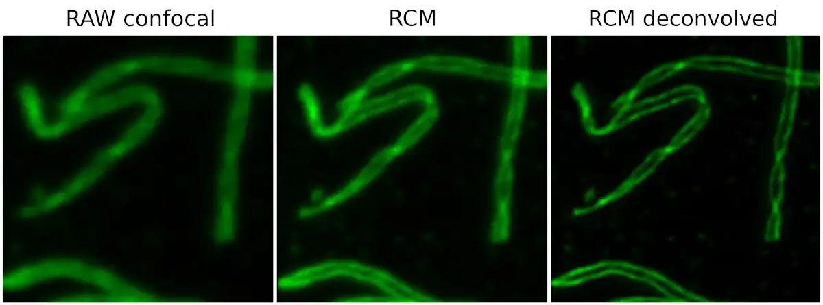 画像は、シナプトネマ複合体の成分である SYCP3(Alexa 488 標識)に対して免疫染色された固定さ れたマウス精母細胞からの核拡散の個々の染色体を示しています。 生の画像は、リスキャンなし(左 図)とリスキャンあり(中央図)の RCM で取得されました。 生の RCM 画像は、Huygens Re-scan デコンボリューションオプション(右図)でデコンボリューション処理されました。 サンプル提供: ス ウェーデン、 Karolinska Institutet の A. Agostinho 氏および C. Höög 氏; オランダ、Confocal.nl の Erik Manders 氏によって実行されたイメージングおよび Huygens デコンボリューション。