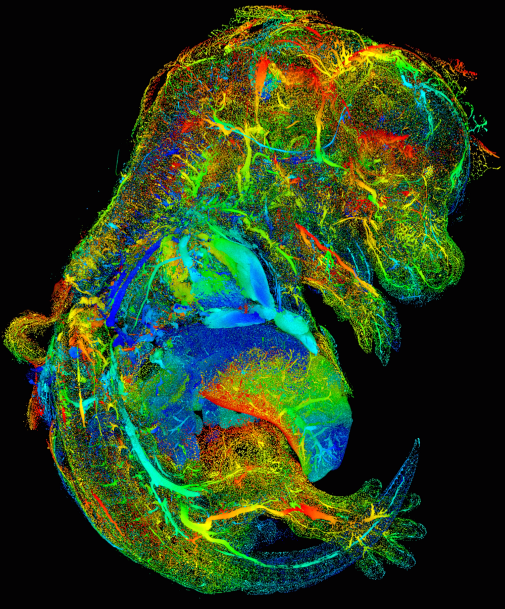Image Description: Erythrocytes that mark the developing vasculature in a mouse embryo (E14.5). This 8x11x2mm specimen was imaged on a multiphoton microscope excited at 790nm using a 25x 1.0NA Objective. Subsequently, the image was stitched, deconvolved with Huygens Professional using a measured PSF, and visualised with depth-coded colouring using the Huygens MIP renderer. Image Imaged by Howard Vindin (Weiss Laboratory, School of Life and Environmental Sciences, Faculty of Science, University of Sydney)