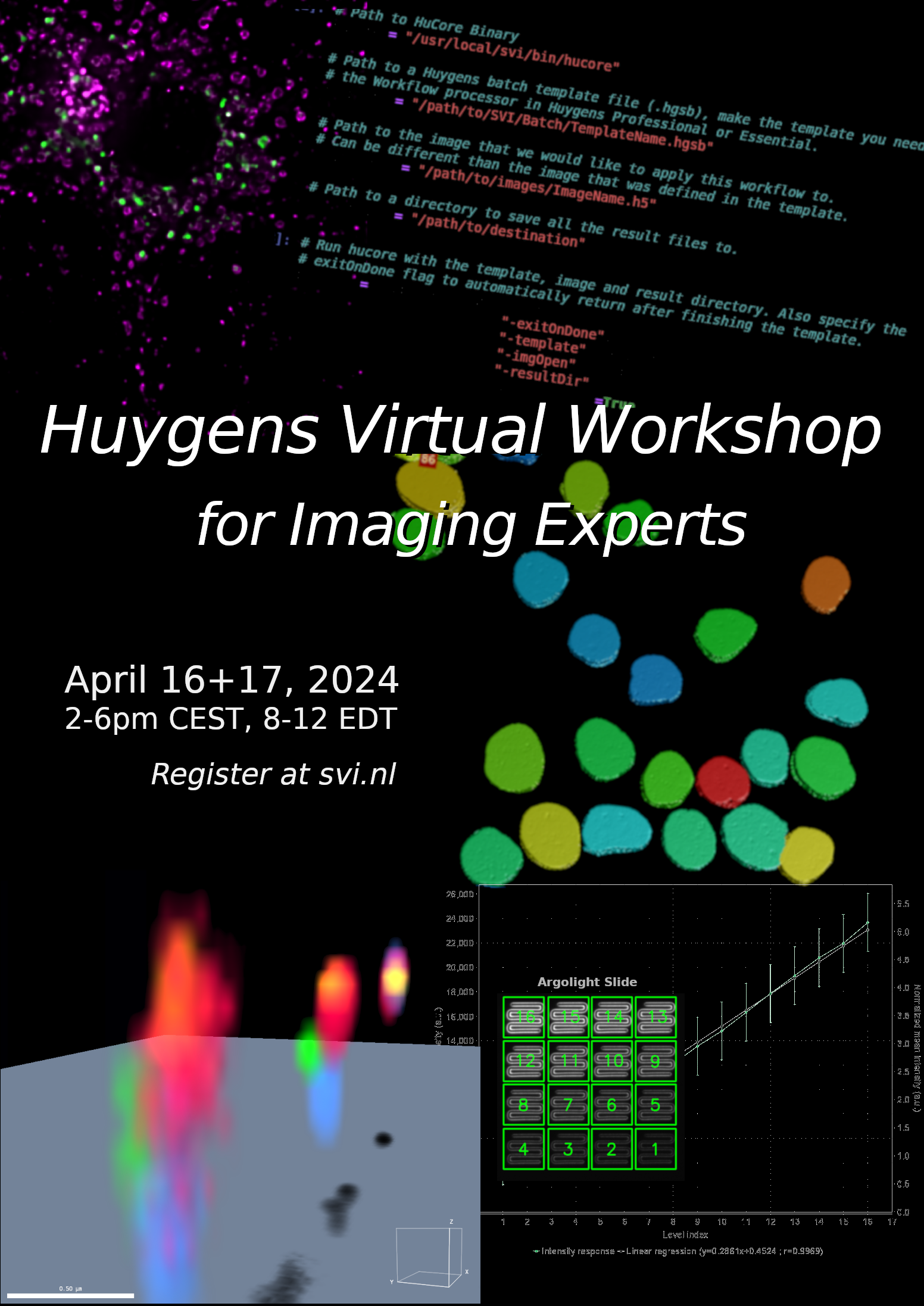 "Introduction to True Image Restoration, Deconvolution, and Analysis" May 15th, 2025 This beginners Workshop was held. Click here for the recording Program 3h Workshop. 09:30 - 09:35 : Welcome (2nd similar session starts at 15:30 CEST) 09:35 - 09:45 : Intro - Why image restoration? 09:45 - 10:00 : Demo - From raw data to analysis within minutes 10:00 - 10:15 : Hands-on 1: Image metadata and Deconvolution Express 10:15 - 10:30 : Hands-on 2: Pyramid of compromise – low signal data 10:30 - 10:40 : Break 10:40 - 10:45 : Access and use of Huygens 10:45 - 10:55 : Hands-on 3: Image acquisition and saving - what to take care of? 10:55 - 11:00 : Hands-on 4: Image Quality Control and Image Restoration 11:15 - 11:35 : Hands-on 5: Image restoration and colocalization analysis 11:35 - 11:45 : Break 11:45 - 11:55 : Overview of Huygens 11:55 - 12:15 : Hands-on 6: Batch processing with the Workflow Processor 12:15 - 12:25 : AI segmentation and advanced use of Huygens 12:25 - 12:30 : Closing remarks