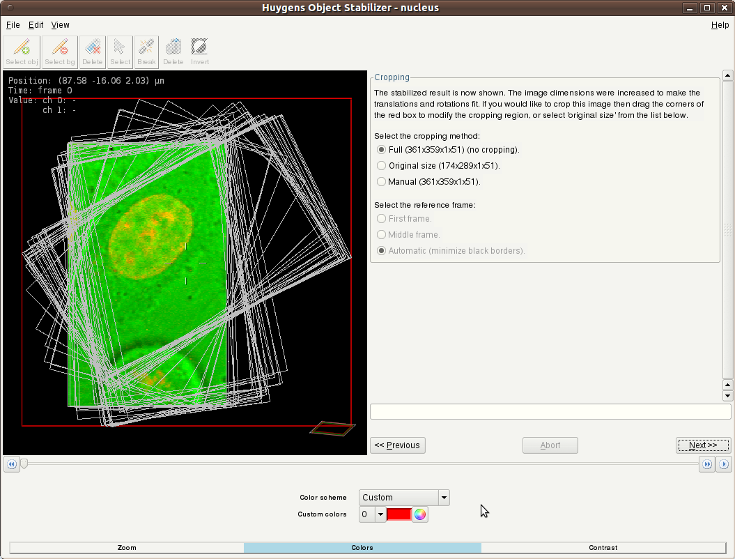 这个功能可以测量样本的位移,例如:细胞的移动,样本因为热而漂移(Thermal drift)及其他的位移,这个位移除了 ⅹyz 的位移也包括样本或图像的转动,Huygens 测量所有的位移后再作出修正,这个功能可以使用于两维或三维的显微图像。