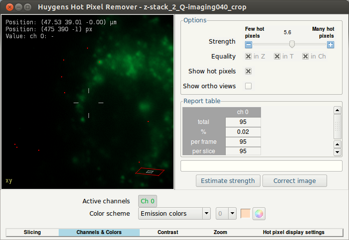这个功能包括在所有 Huygens 软件 (Essential 及 Professional)。这个功能是免费的,它可以侦测 Hot pixels (图像中亮度极高的小点,这些小点是由显微镜的 CCD 产生的,小点的多少往往与 CCD 的温度成正比)。 huygens 软件会把小点侦探出来再跟据邻近的pixel 作出修正。
