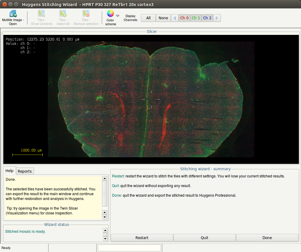 拼图功能可以拼接大量的两维及三维显微图像,这个功能目前支持 Leica 的 *.LIF 文件及 Zeiss 的 *.CZI 文件。 Huygens 读取文件的资料,把图像排列,侦测重叠部分再作出拼接。除此之外,这个功能具备有自动或测量的暗角校正及去卷积的选择,方便用户的需要。
