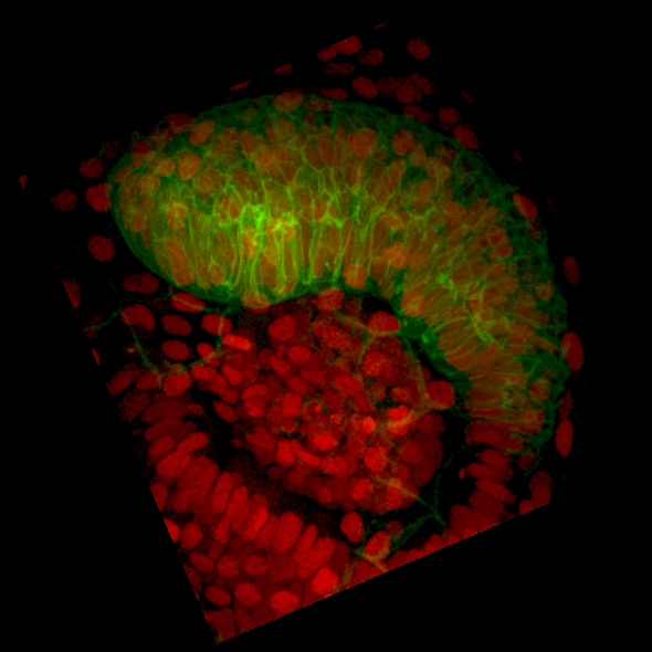 Here is a movie representing a 3D reconstruction of an in vitro multilayer intestinal epithelial cell culture derived from human induced pluripotent stem cells (hiPSC) grown in a Transwell 2-chambered culture system. Actin (in red, as detected via phalloidin staining) and ZO-1 (in green, detected by antibody) were labeled before confocal immunofluorescence detection. A Z-stack was acquired with a Zeiss LSM 710 confocal microscope and then deconvolved (measured PSF) with Huygens Professional. The 3D rendering and movie were generated with the Huygens' surface renderer tool. Actin is typically strongly detected at the apical surface of polarized epithelial cells within actin microfilaments. The actin detection threshold was adjusted in order to only detect its expression at the surface of the epithelium. ZO-1 is a scaffolding protein essential in intercellular tight junction formation and are a key component of the intestinal epithelial barrier. It is located in the upper lateral part of the polarized cells and as such helps delimitate single cell areas in this image. The movie allows the observation of deep crypt-like invaginations of the epithelial culture. The experiment was performed in John D. Rioux' s laboratory and the imaging, deconvolution and 3D rendering was produced by Louis Villeneuve