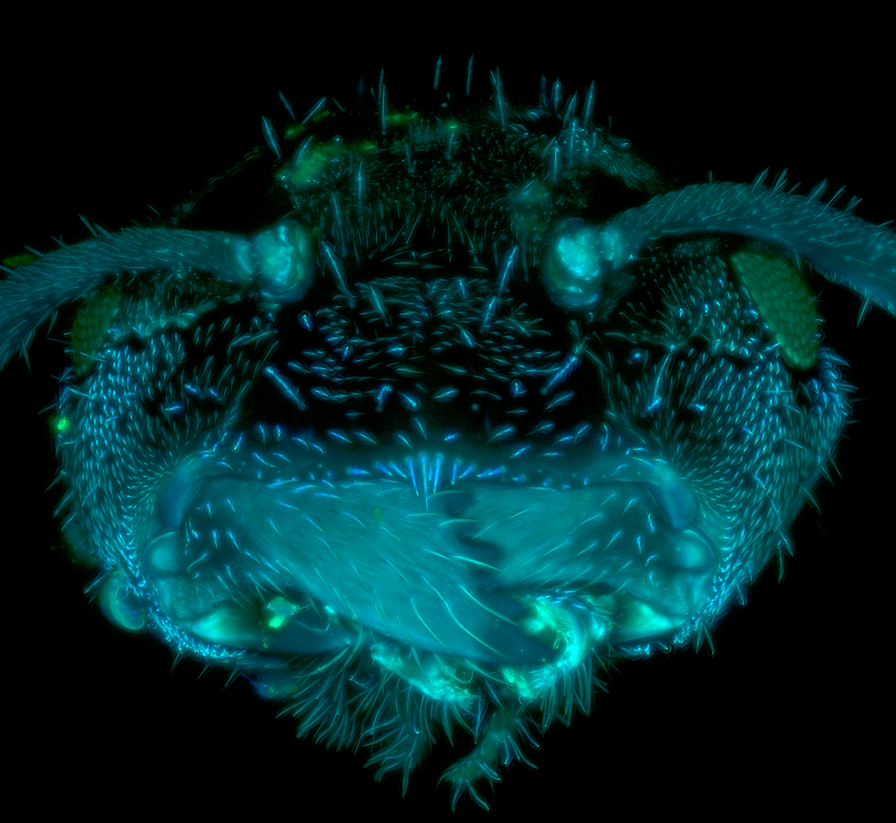 ''Ant head autofluorescence captured with a Zeiss 710 confocal microscope using 488nm laser excitation and detection of two channes (blue and green). The acquired 3D dataset was deconvolved and maximum intensity projection image was rendered with Huygens. }