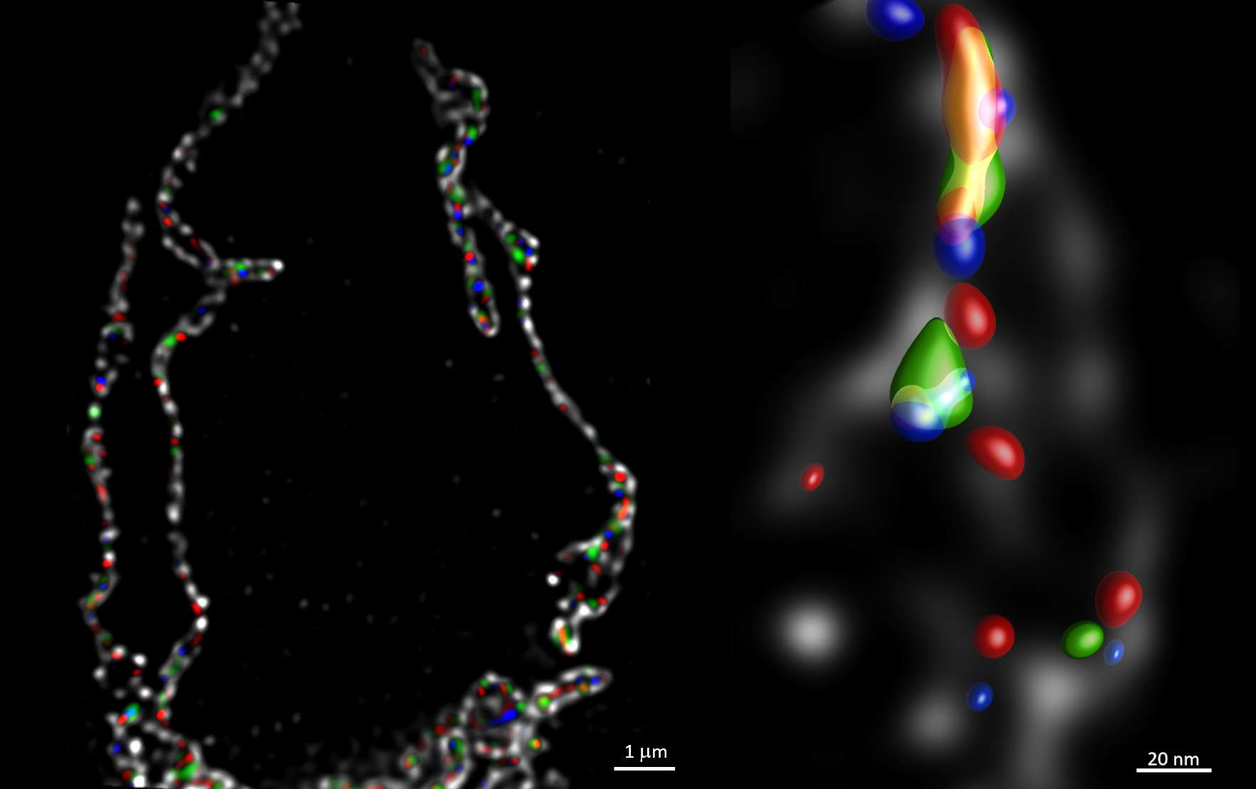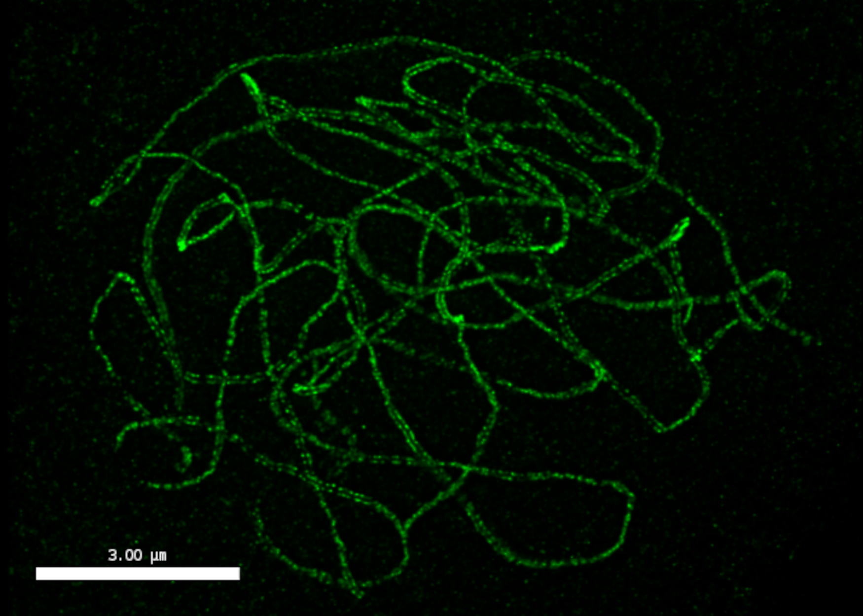 This picture stands out because of the high quality of microscopy and processing, showing a Maximum intensity projection of Huygens deconvolved STED image of a meiotic cell of Arabidopsis thaliana. Immuno-localization (green) of ZYP1, which forms the synaptonemal complex, a structure that zips the pair of homologous chromosomes all along their length at meiosis. ZYP1 is organized in a head-to-head configuration, with the C-ter end of the proteins on both sides, connected to the two homologous chromosomes. As the antibody recognizes the C-ter of ZYP1, the signals appear in super-resolution as two parallel lines distant by 78nm, corresponding to the pair of chromosomes.