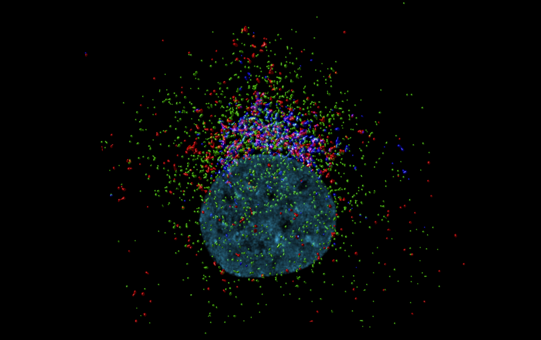 Challenging imaging and image processing. This is a Huygens maximum intensity projection of a short extract of a 4D time lapse of live 3D MCF10A spheroids, with multiple cells in different stages of mitosis, imaged on a Leica Stellaris 5 Digital Light Sheet. Live staining of the DNA (green), microtubules (blue) and lipid membrane (red) in the spheroid can be seen in high resolution in a 3D volume. This imaging technique allows us to quantify and track mitotic segregation errors and chromosomal instability features for the identification of predictive biomarkers for anti-mitotic chemotherapies. Fusion, deconvolution, and rendering of multi-view spatiotemporal light sheet data is completed with Huygens software.{CENTER}