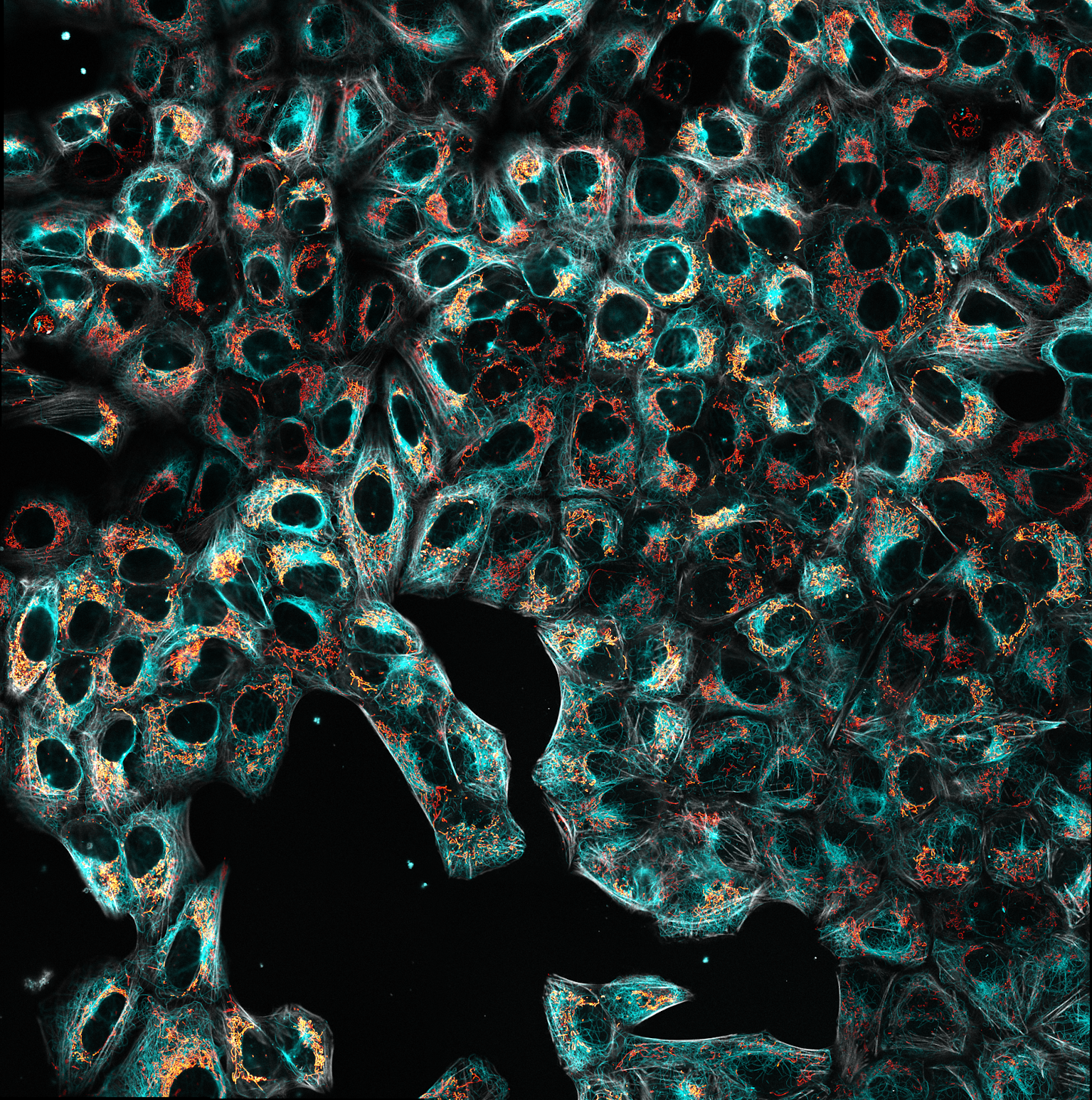 Large FOV of living U-2 OS cells stained with mitochondria (red-hot), tubulin (cyan) and actin (grey) probes. This confocal tile scan was acquired on the Abberior Facility Line, and was deconvolved and stitched using Huygens Essential.
