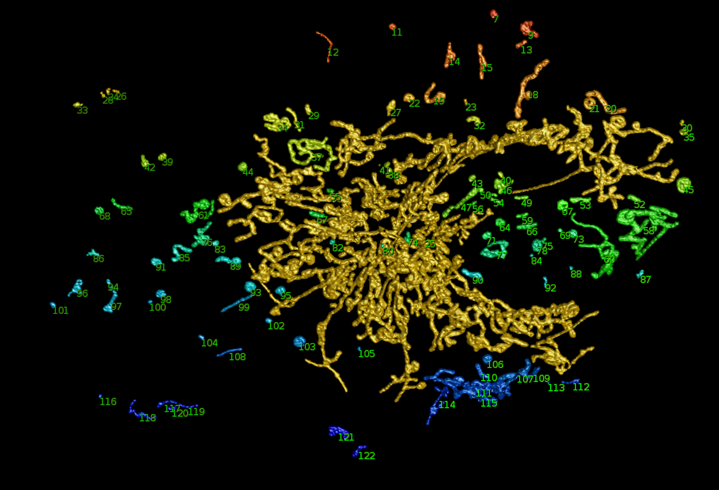 Mitochondria in COS7 cells stained for Tom20 were imaged as a tile-z-stack with a Leica SP8 STED 3X. The image was deconvolved, surface-rendered, and segmented in Huygens (numbers label individual objects in Huygens Object Analyzer).