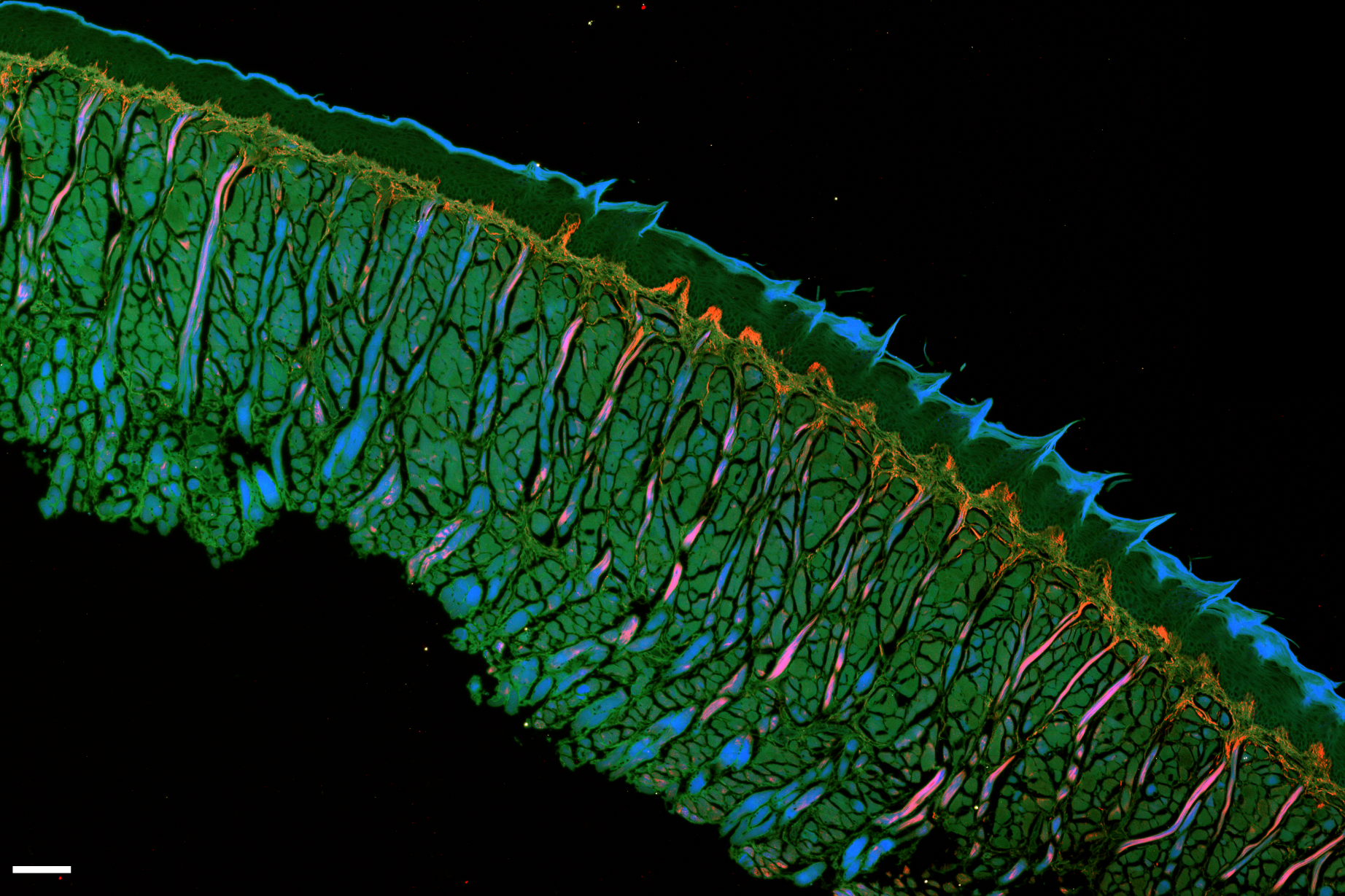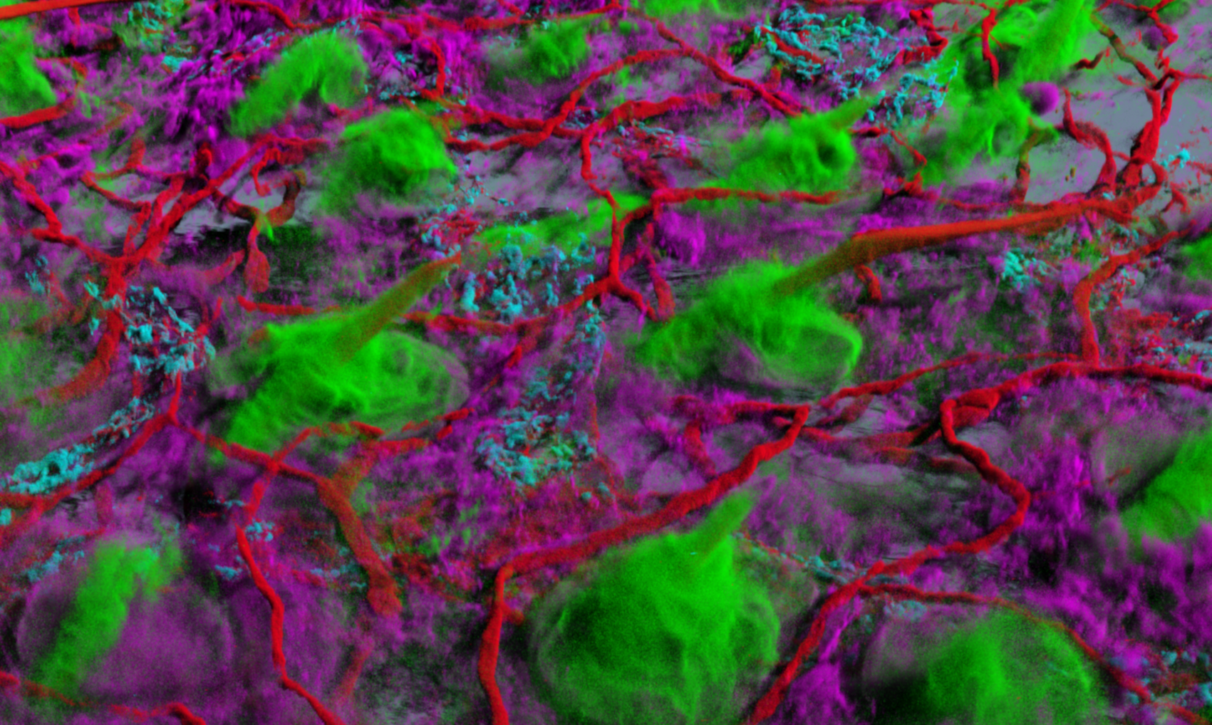 Various Huygens options were used to produce this high quality and artistic picture. Mouse hair follicle visualized with the Huygens SFP renderer. Green is epithelial cells, Red is blood vessels, Cyan is lymphatic vessels, Magenta is CD45. Image was acquired on Leica Stellaris WLL system/confocal and opened in Huygens and corrected for unwanted movement (Object Stabilizer) and crosstalk, deconvolved, corrected for chromatic aberration, and visualized using Huygens SFP renderer.