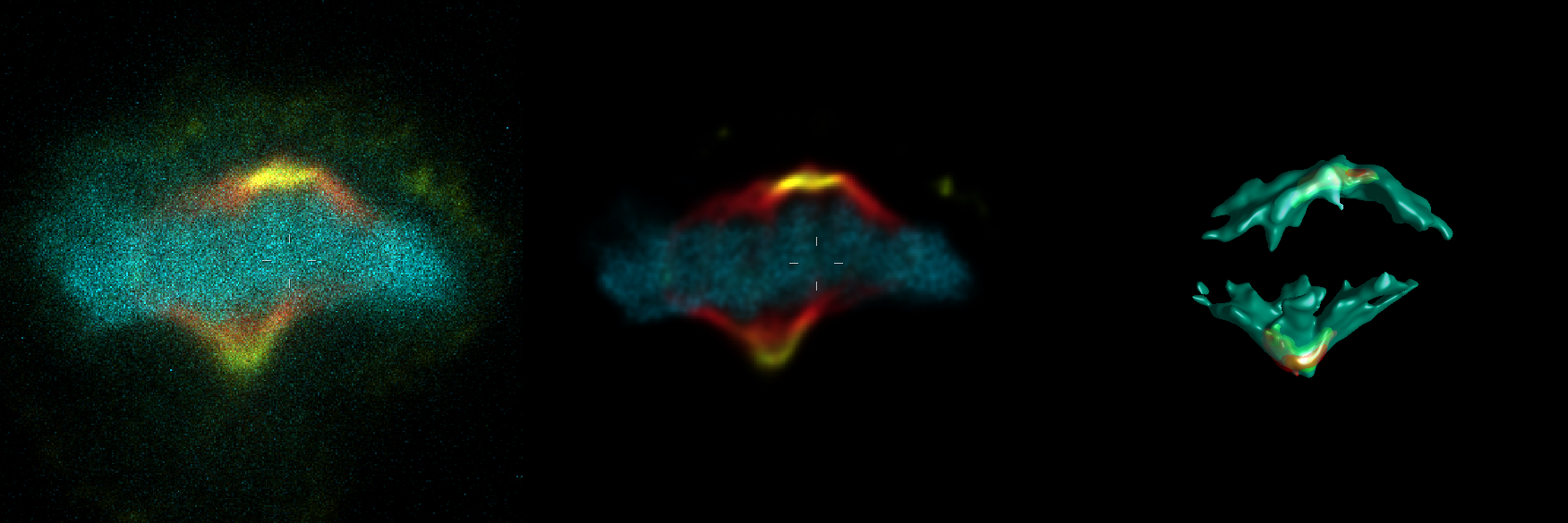 High quality data showing a Human cell in metaphase. During this stage of cell division, condensed chromosomes line up at the metaphase plate and attach to the mitotic spindle, a diamond-shape structure made up of microtubules and associated proteins. Left image was acquired using a Zeiss LSM800 confocal with 63X/1.4 objective. After acquisition, it was deconvolved with Huygens software (middle image), and rendered with Huygens Surface Renderer (right image). Left and middle images show DNA in blue, microtubules in red, and associated proteins in yellow. Right image shows microtubules in blue and associated proteins in green and red. This image was created with help of Mrs. Carmen Sanchez Jimenez from the Microscopy facility