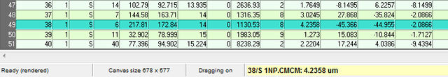 The second letter in the SegGroup. column informs whether the object you clicked was in the front (F) or the back (B) position. This is only relevant in the following situation: it may happen that two objects in different segmentation groups overlap in space (or they apparently do from the current point of view) and when you click somewhere on the screen you are actually selecting both of them, if the segmentation mode is PS or All (18). In that case, two rows are added to the table, and this second letter lets you know which of the two was in front of the other, from the current point of view.