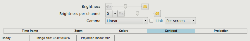 The 'Gamma' drop down menu provides you with a linear and some non-linear ways of mapping data values to pixel intensities. If the 'Link channels' box is checked, this means that the way of mapping data values to pixel intensities is the same for all channels; if not, the range is automatically adjusted for the minimum and maximum in each channel.