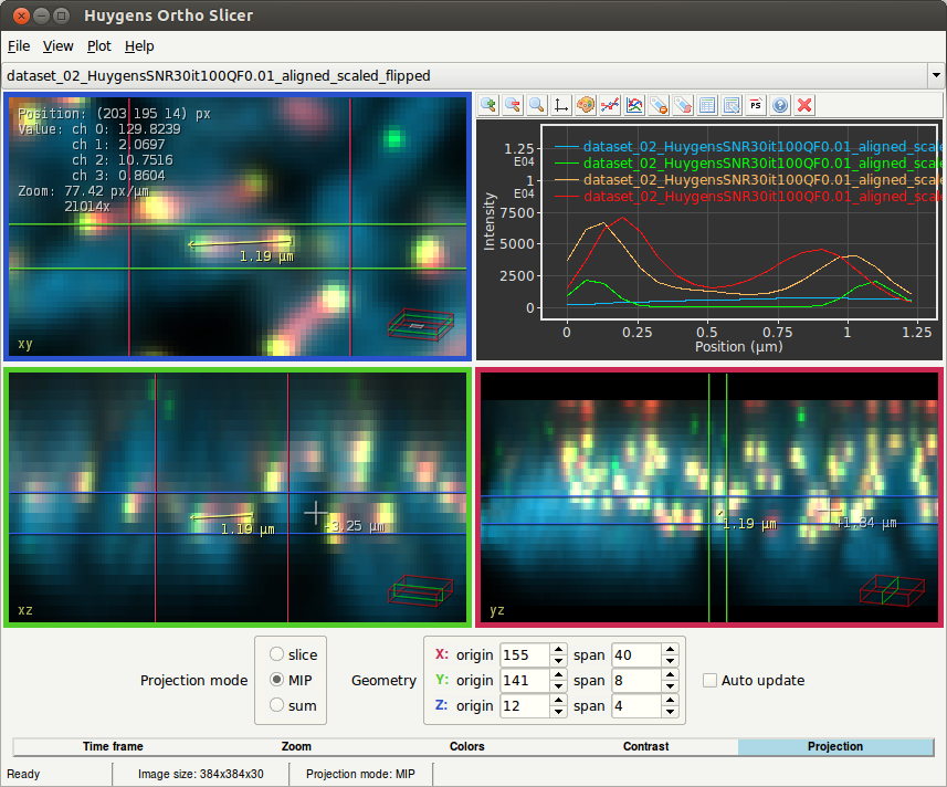 New in this Orthogonal Slicer version is the possibility set the projection mode to Slice, MIP, or Sum. The colored sliders in the different views define the borders of the projected region. The start screen of the OrthoSlicer has the Projection tab at the bottom active, and shows the geometry of the projected area with two values (origin and span) for each view. If you select Slice as projection mode, the span is set to one, as just one slice is shown. ((MIP) maximum intensity projection) and Sum show you a range of slices. The MIP shows parallel rays traced from the viewpoint to the plane of projection and only displays the maximum intensity of each ray, whereas the Sum shows you the sum of the voxel intensities along each ray. If Auto-update is checked, Huygens will update the views in real-time when the position of the sliders is changed. If unchecked, views will only be updated when the mouse button is released.