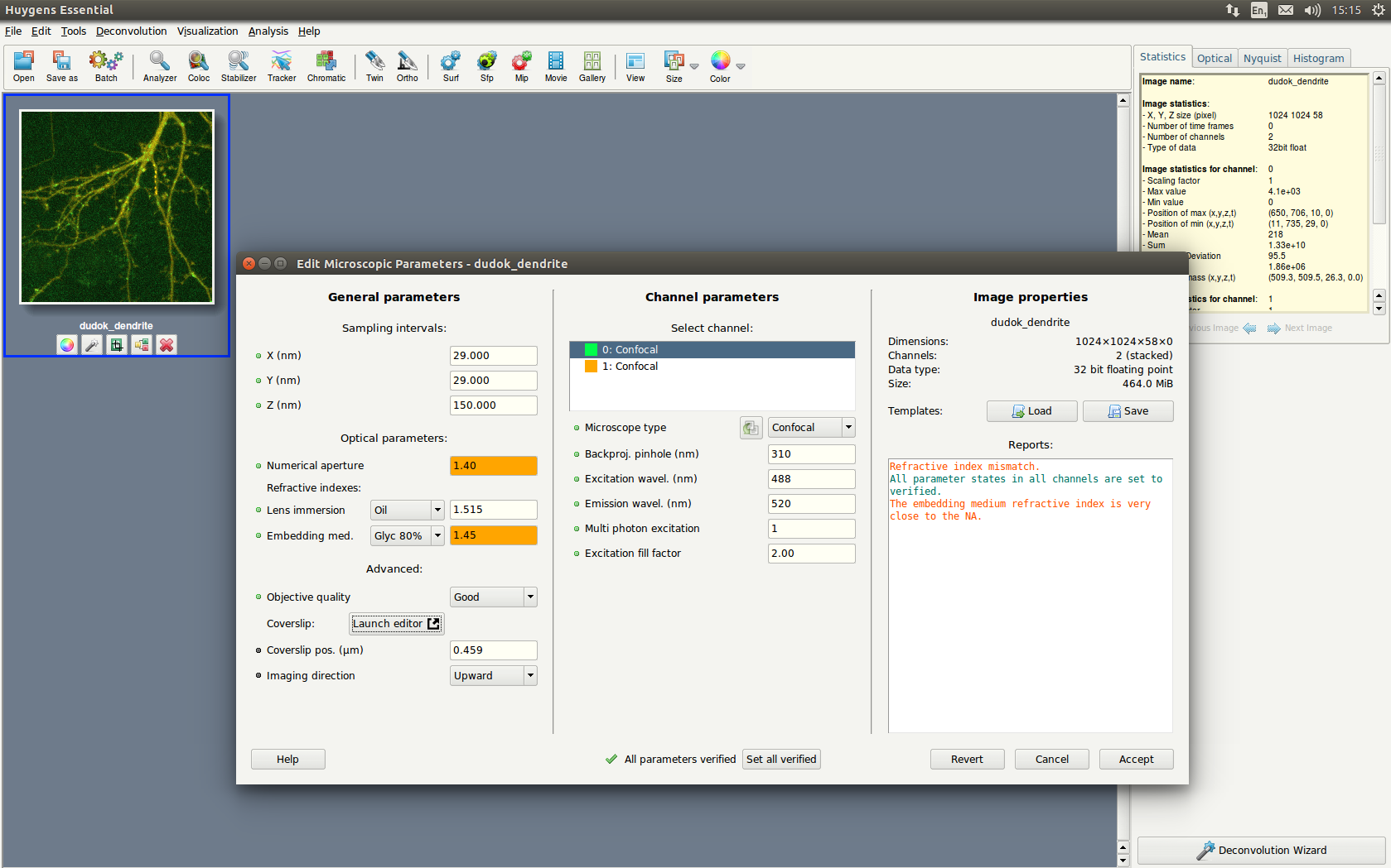 Microscope parameters can be saved by the acquisition software as metadata with the image file. Huygens reads this metadata automatically from the file when an image is opened. You can have a look at these parameters immediately via the tabs (Statistics, Optical and Nyquist) located at the right of the main window.