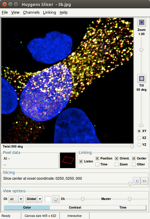 The Pro Slicer is a newly developed visualization tool for the Huygens Professional. Like the Twin Slicer and the old Pro Expand Viewer, it shows a single 2D plane extracted from a 3D volume.