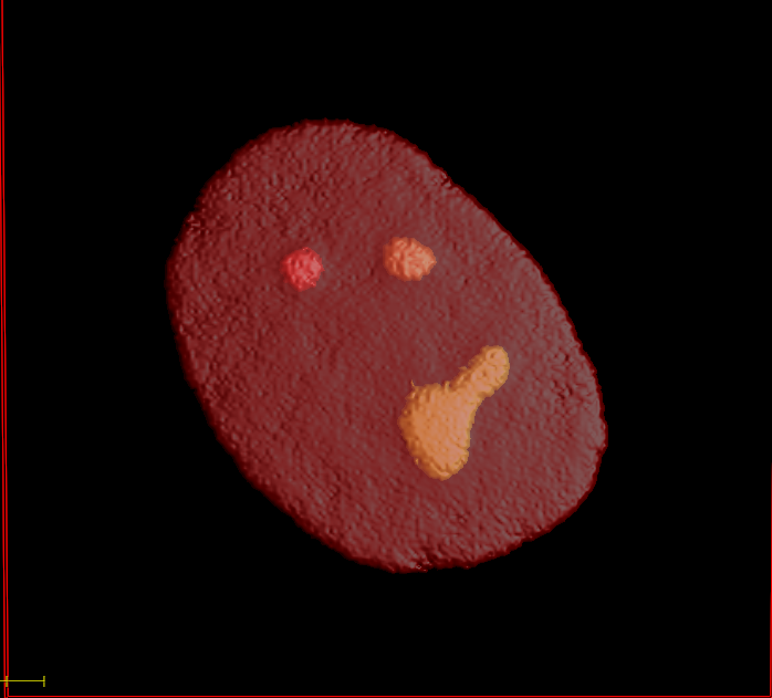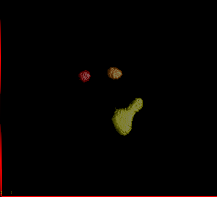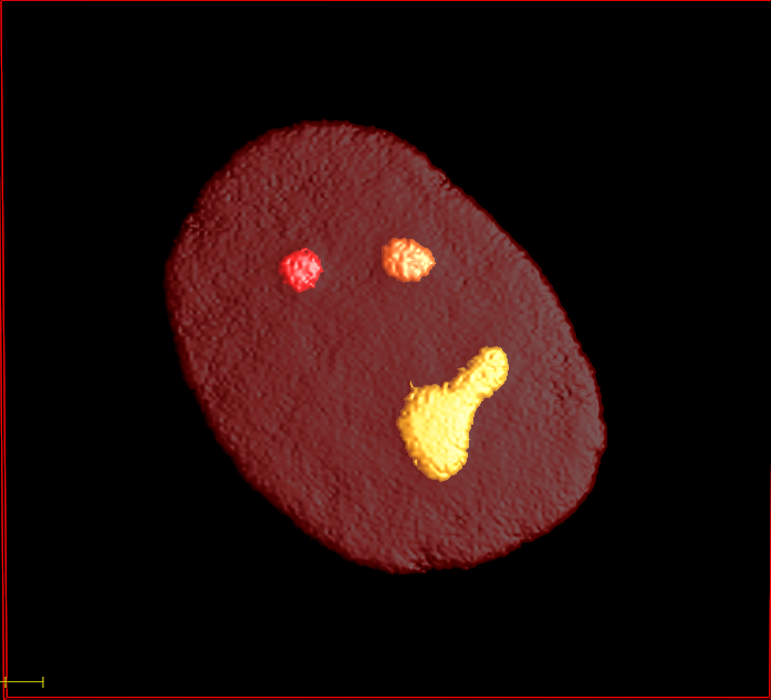 次の例を参照してください: 細胞核の 3 チャネル画像が Huygens の Object Analyzer で視覚化されています。 1 つのセグメンテーショングループには、核の DAPI チャネル(画像のチャネル 2)の 2D 最大強度投影が空間参照として含まれています。 他の 2 つのセグメンテーショングループは、チャネル 1 とチャネル 0 の対象物の等値面を表示するために使用されます(一方は、赤黄色、もう一方は、青みがかった色)。 3 つのアクティブなセグメンテーショングループは、最終的な 3D レンダリングで結合され、MIP の各部分がビジュアリゼーションボリュームの正しい場所に配置されるため、等値面の一部がその下にあり、他の部分が上にあります。