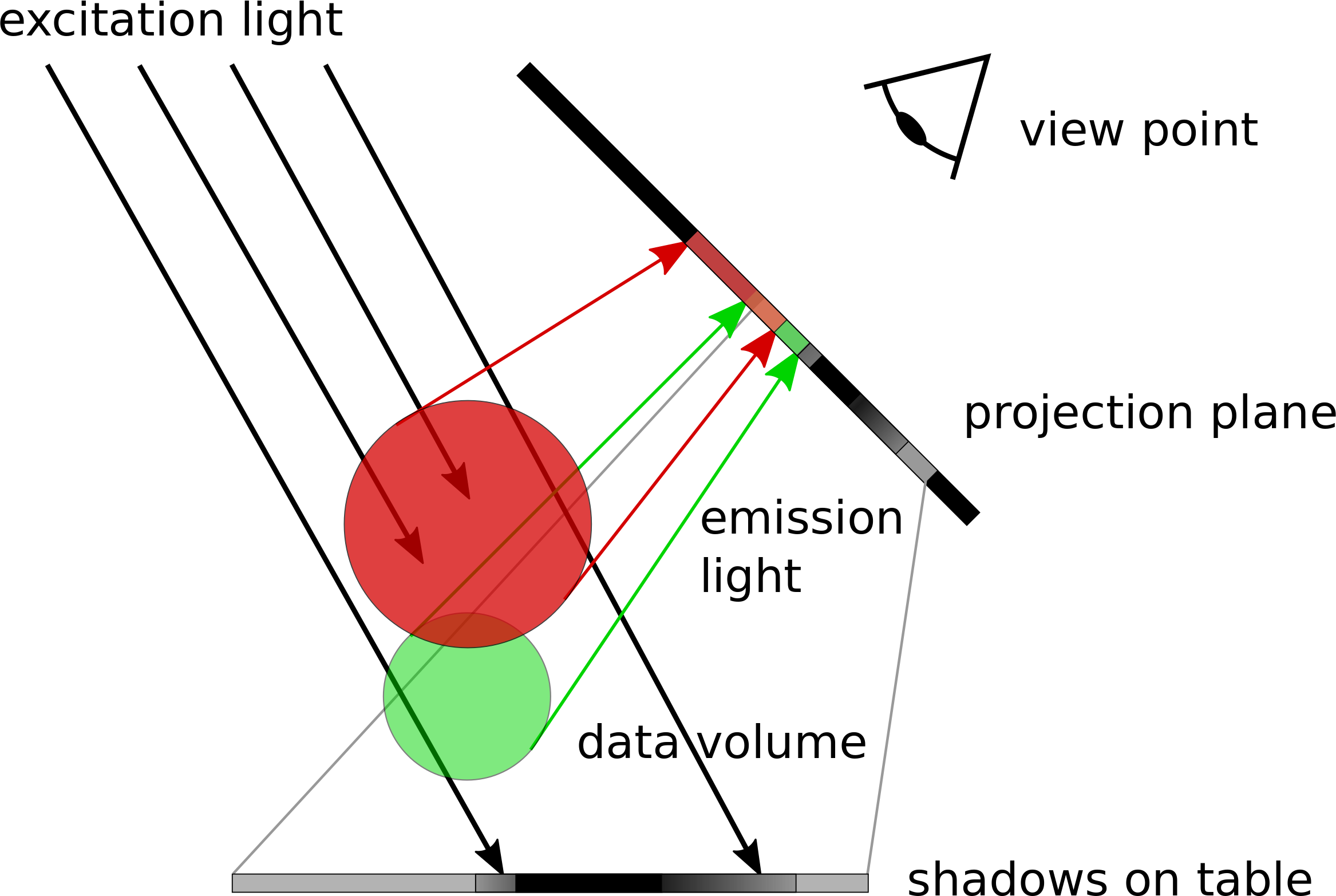 To excite the fluorescent matter, light with a given Excitation Wavelength must traverse other matter. The resulting attenuation of the excitation light will cause objects, which are hidden from the light source by other objects, to be weakly illuminated, if at all. The attenuation of the excitation light will be visible as shadows on other objects. To optimally use the depth perception cues generated by these shadows a homogeneous plane (the gray table) is placed below the data volume on which the shadows are cast.