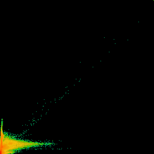When, for example, the first channel bleeds through the second channel (which is known as crosstalk or bleedthrough), then there is always a little signal in the second channel at the positions when there is signal in the first channel. This is visualized by an empty triangular shape, from the origin along the axis of the first channel. | |