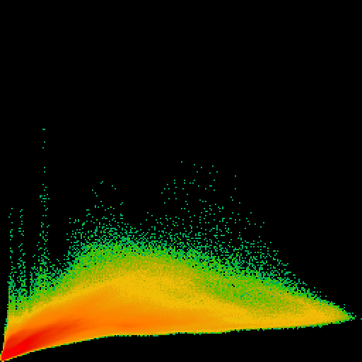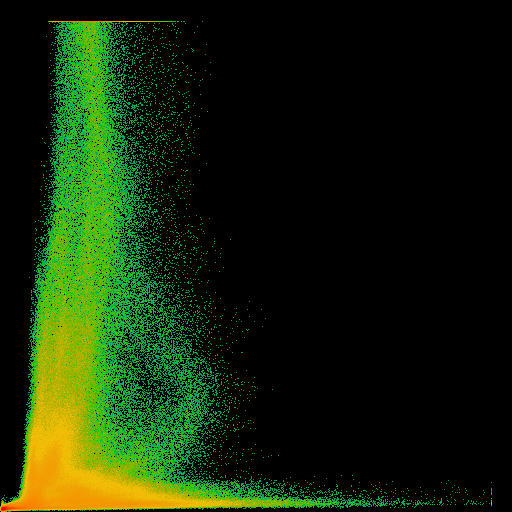 Clipping is shown very clearly within a 2D histogram. In the example in the left, there is clipping in the second channel. Shown by the "boundary" at the top. It is always recommended to avoid clipping, since this is unrestorable information loss which will affect deconvolution. | |