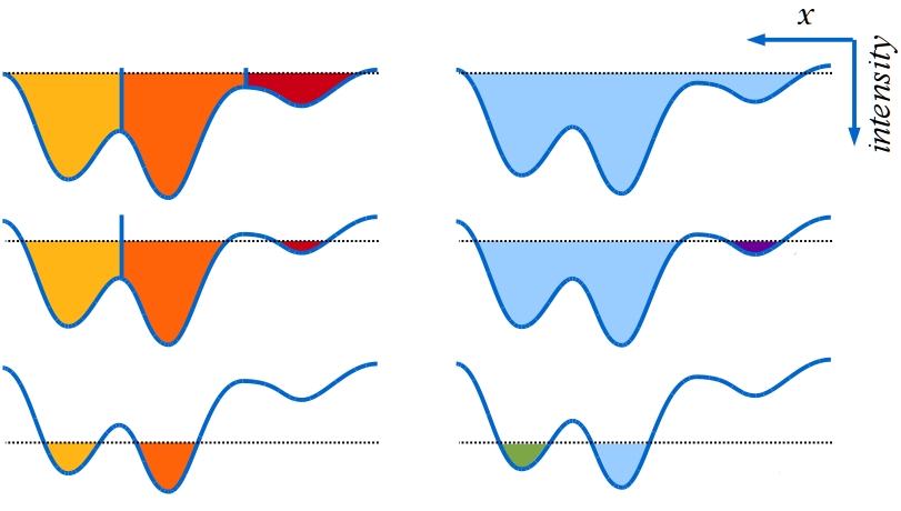 画像の強度が y スケールにあり、その位置が x スケールにある画像のラインプロファイルを見ると、画像は、トポグラフィーレリーフとして見ることができます。 このビューを反転し、レリーフをゆっくりと溢れさせると、分岐点セグメンテーションによってそこに分岐点が構築されます、そうしないと、分岐が 1 つの大きな分岐に統合されます(ここでは、水が互いに「接触」し始めます)。