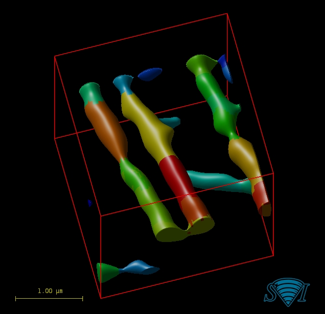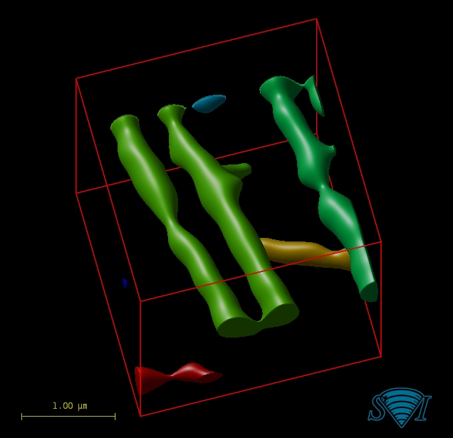 詳細なスケールで画像を解析するには、セグメンテーション技術が必要です。Huygens ソフトウェアの Object Analyzer は、このセグメンテーションに依存しています。 ガベージボリューム拡張機能を使用した SeedAndThreshold 方法は、対象物を検出するための単純ですが、効果的な手法を示しています。 ただし、この方法は、対象物が互いに非常に近く、点像分布関数のぼやけが干渉する場合には、効率的ではありません。 そのような場合、分岐点セグメンテーション法は、他の方法では、1 つの対象物にマージされる対象物を分離するソリューションを提供します。